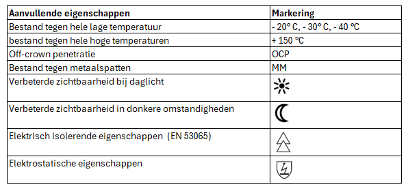 De EN 397 specificeert de volgende verplichte en aanvullende eigenschappen van een veiligheidshelm.